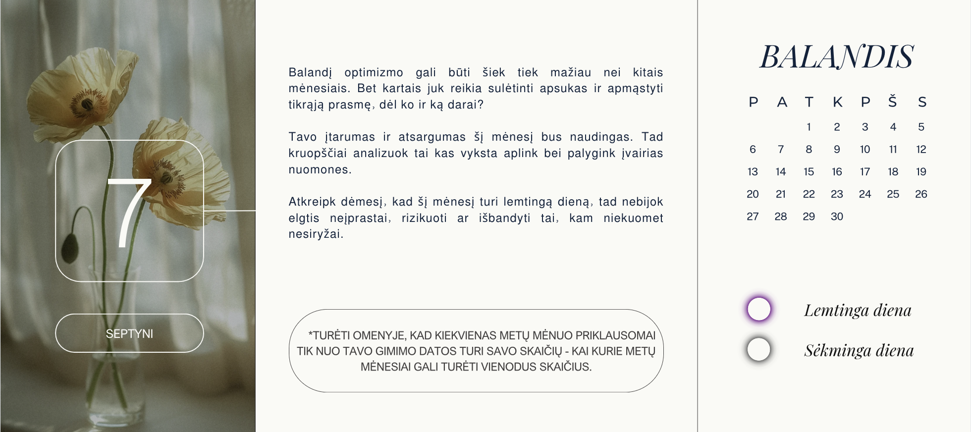 Lemtingų dienų kalendorius – kviečiantis drąsiau žengti į naujas galimybes ir išnaudoti stipriausias savo energijos bangas.