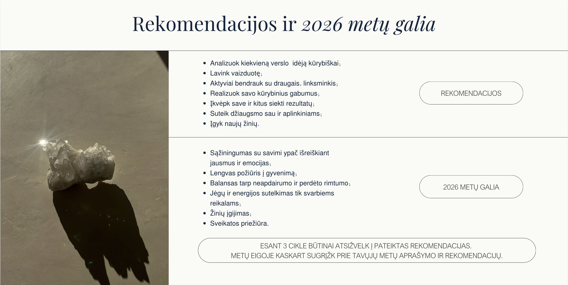 Metinės ir mėnesinės rekomendacijos pagal tavo gimimo datą – išskirstytos pagal svarbiausius gyvenimo sektorius, kad galėtum matyti metų kryptį aiškiau ir veikti tikslingiau.